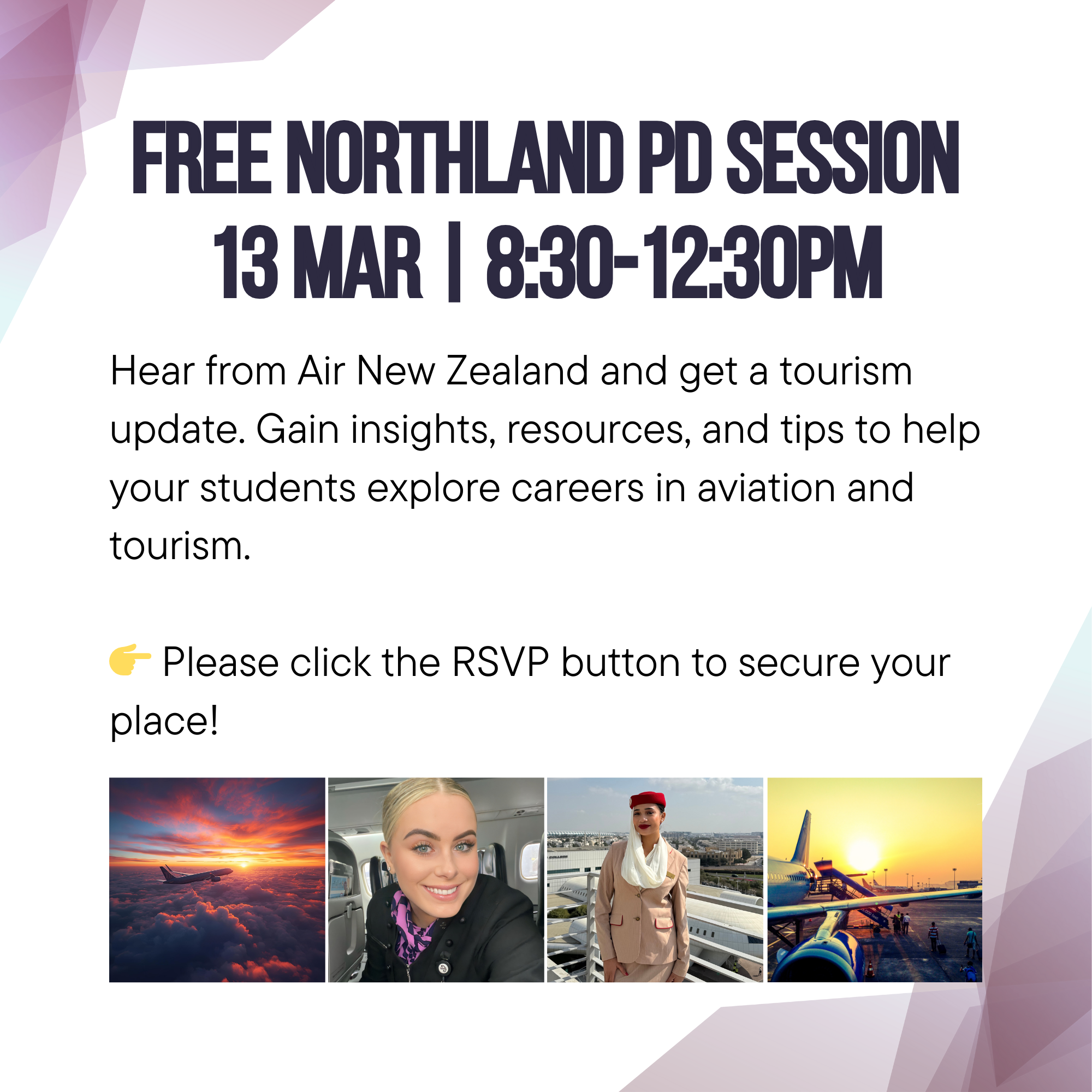 Join us 8:30am–12:30pm for a special session with Air New Zealand’s Mark Paterson (Cabin Crew Manager) and Elizabeth Bentley (Flight Attendant). Learn about recruitment, company values, and tips to support your senior students’ career pathways.